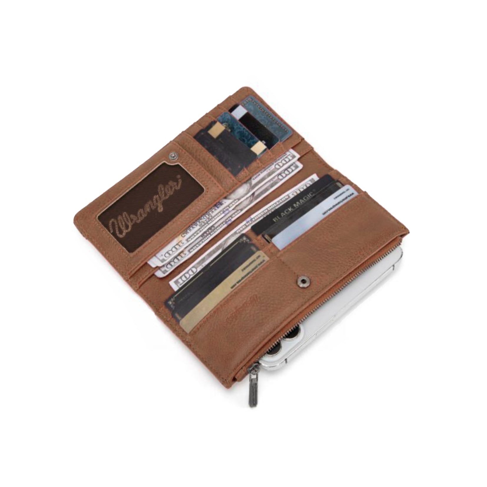Inside wallet has 10 credit card slots, 1 ID slot ,and 3 bill compartment