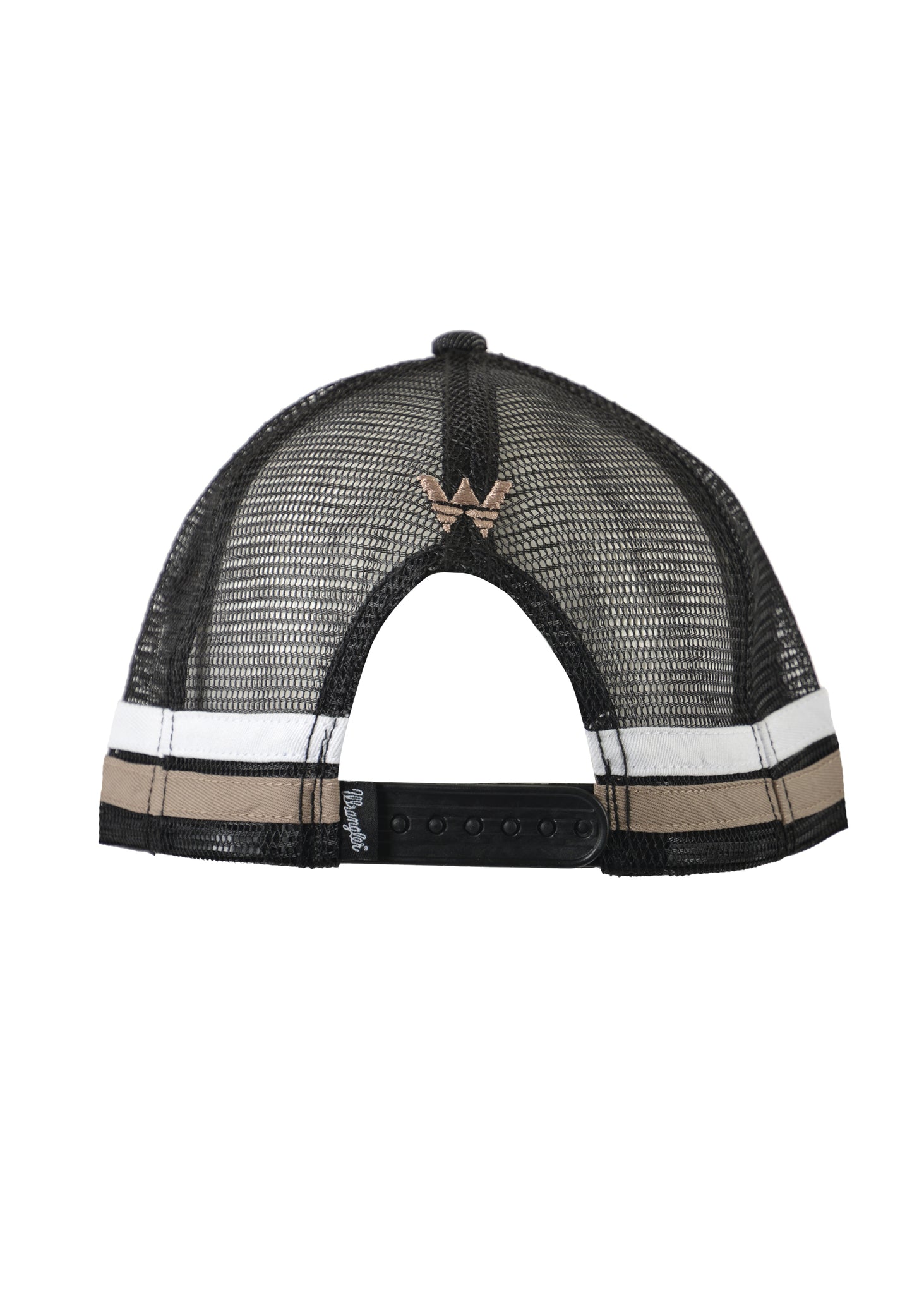 One Size, square front 5 panel trucker cap, front multi colour Wrangler iconic logo rubber badge, contrast peak with embroidery, contrast sandwich peak, side panel taping, contrast crown piping, Wrangler back embroidery