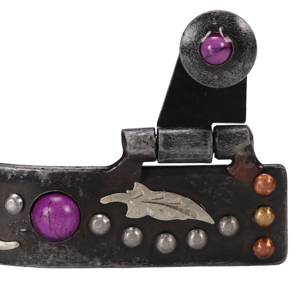 • 3/4" Band and 1,1/2" Shank. • The band and shank feature silver feathers. • Purple stones are inset, along with metal dots along the heel band.
