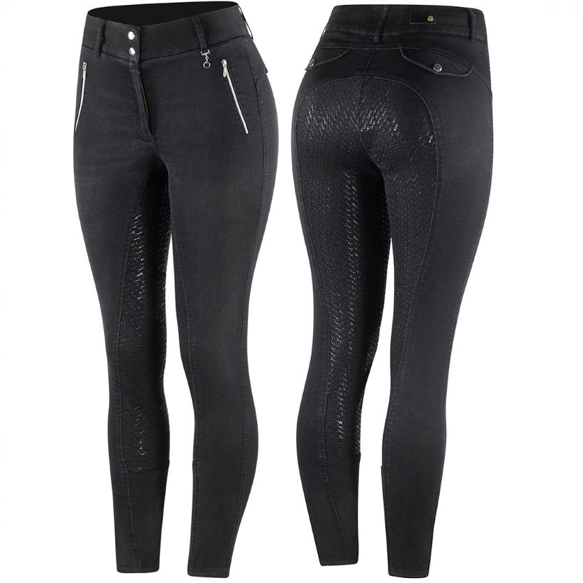 The Horze Nicole Denim Breeches feature a high waist for the ideal fit, and a silicone full seat for the perfect seat in the saddle. They are made from cool denim material, making them look just like jeans. A bit pendant at the belt loop adds a stylish detail, and zipper pockets at the front offer enough room for your phone. Silicone logos inside the waistband make sure these breeches don't slip.
