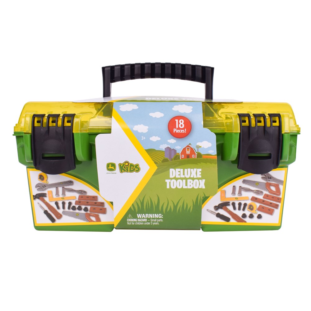 18 PIECE PLAY SET: Includes 18 realistic tools and accessories with a working tape measure, perfectly sized for small hands to enjoy imaginative play. TOOL BOX WITH SNAP LATCHES: Durable tool box with easy to carry handle and two locking snaps, makes for easy storage and on-the-go play! PRETEND PLAY: Use plastic versions of real-life tools to make pretend home improvements. Build hand/eye coordination and a strong understanding of what each tool is used for! SAFE AND DURABLE: Designed with safety in mind, the toy tool box is made of high-quality, durable materials for indoor and outdoor play! GREAT GIFT: This imaginative tool toy is a great gift idea. With the official John Deere colours, it is perfect for both boys and girls. Give it as a birthday, Christmas, or special occasion gift.