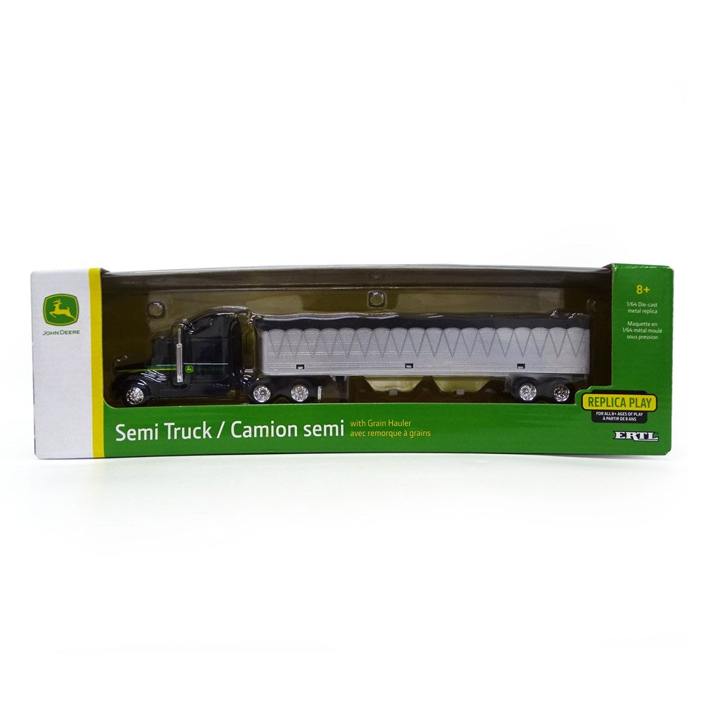 The enthusiastic collectors of farm and construction die cast replicas will enjoy the functioning features of this scale model! The die cast grain trailer feature a removable tarp and also easily detaches and attaches to the semi cab. Authentic John Deere graphics on the truck round out the exceptional details on this item. Age 8+