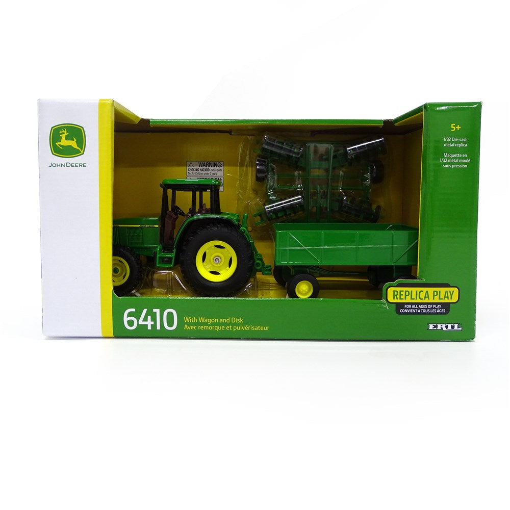 Kids and collectors alike will love having these 1:32 scale John Deere replicas to add to their collection. Each features authentic John Deere details. Clear cab windows on the 6410 Tractor provide a nice view of the interior. Articulated parts, sturdy diecast and plastic construction, and free rolling wheels are great for play. The open box packaging is perfect for a collector's display.