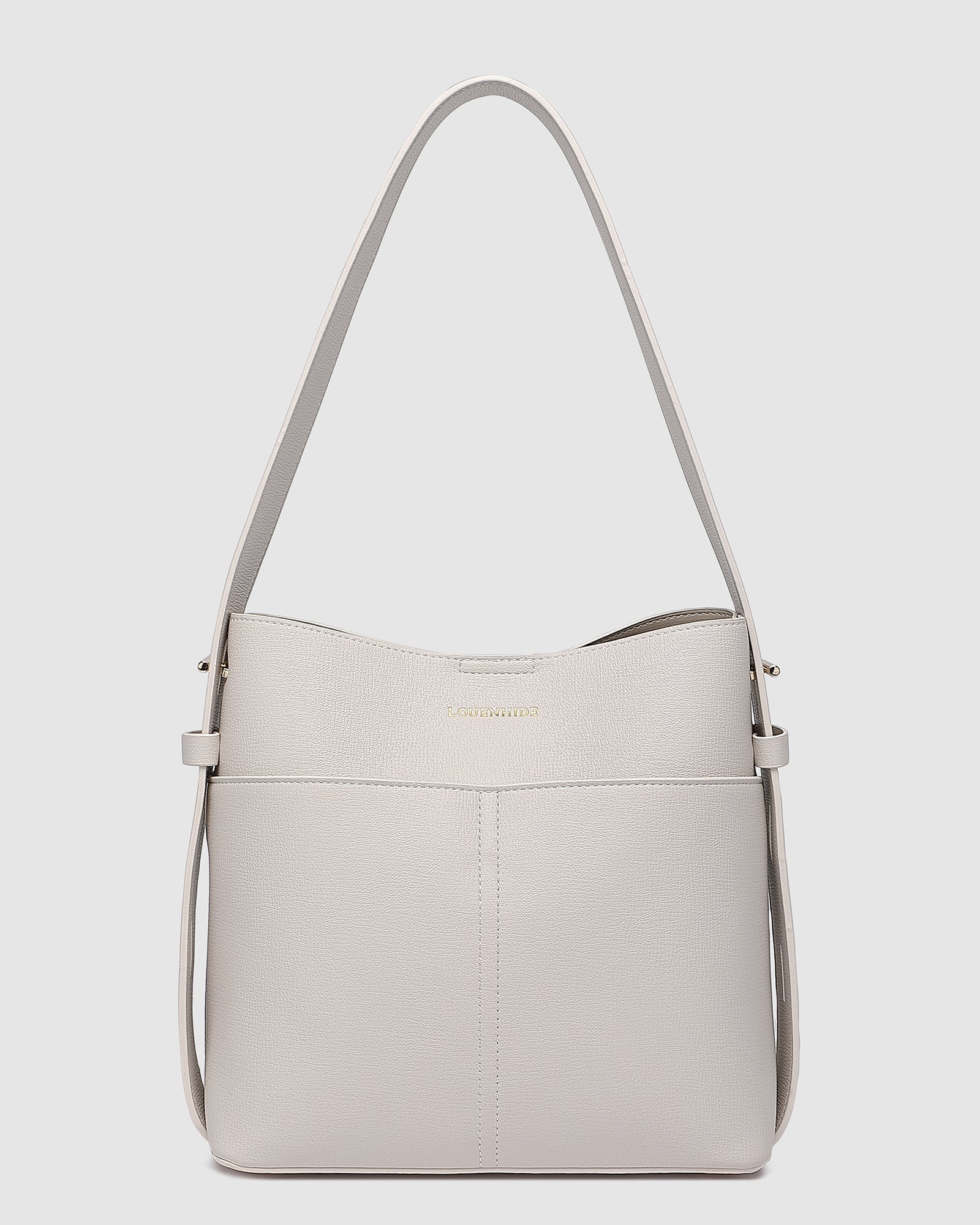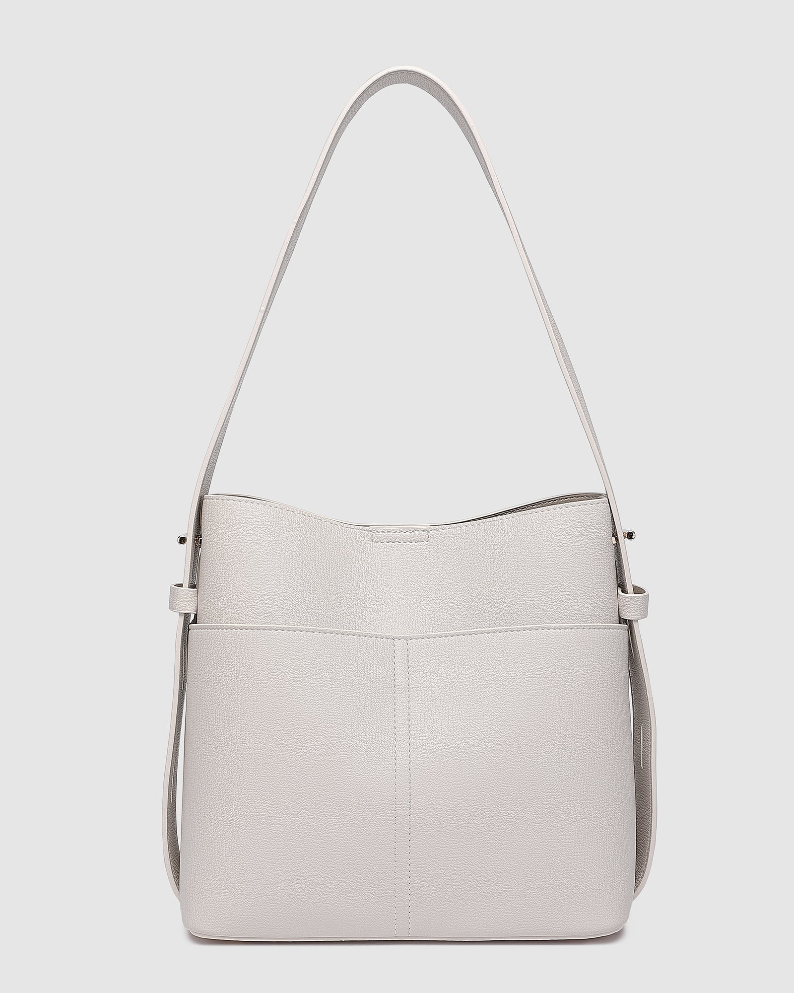 The Louenhide Samantha Vanilla Handbag is crafted for the modern woman who values style without compromising functionality. This small bucket bag features a sleek and simple silhouette that is effortlessly timeless. When needing to access your phone and sunnies with ease, simply utilise the convenient external slip pockets - the ideal place for your most used essentials. With an additional internal clutch, you can effortlessly compartmentalise your essentials or downsize for your on-the-go moments by attaching the crossbody strap. Upgrade your everyday functionality with the Samantha Vanilla Shoulder Bag.
