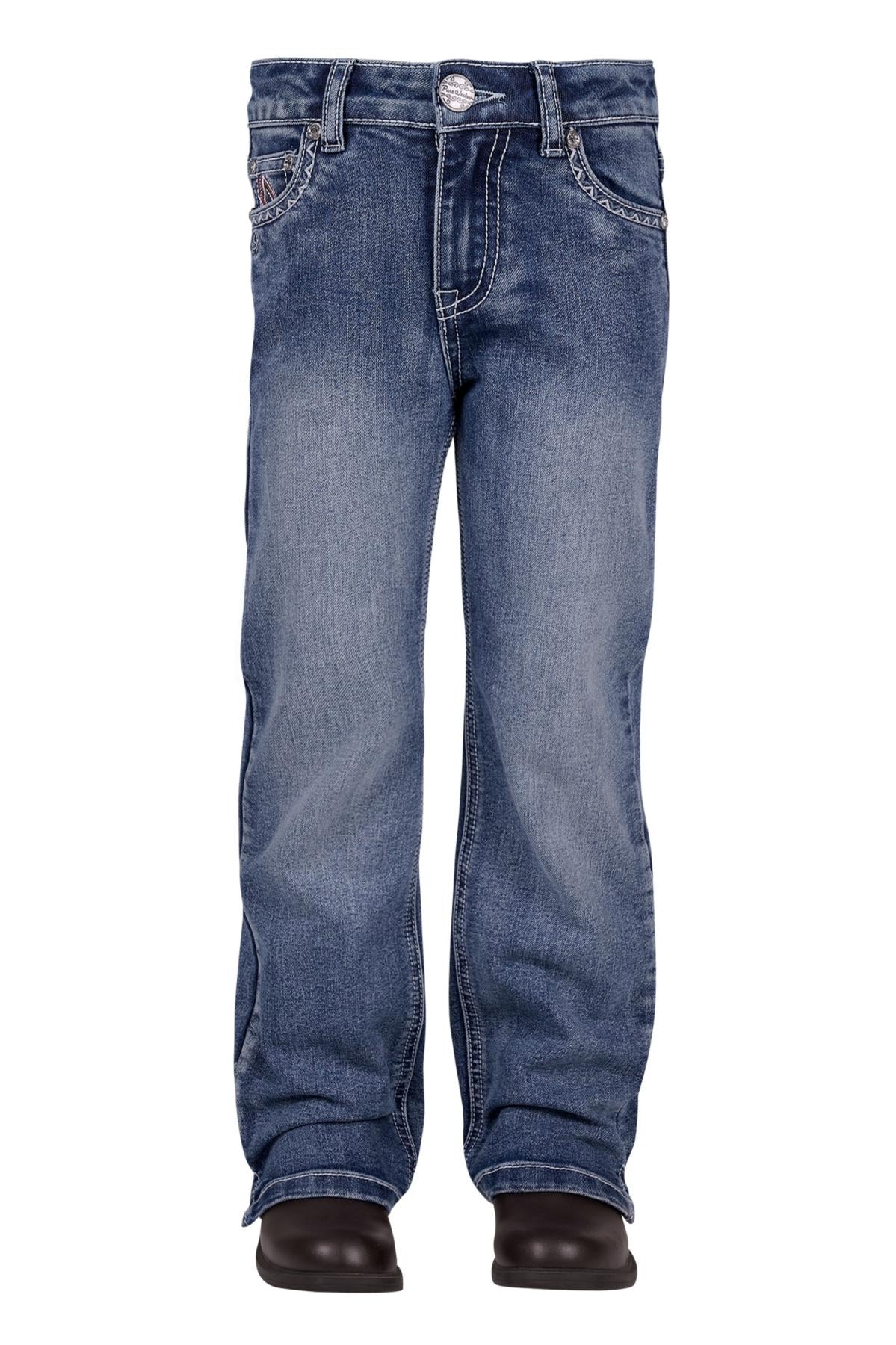 Straight leg; stretch for comfort and movement; mid rise; adjustable elastic waistband on all sizes; logo shank button; diamanté rivets; woven logo label on back yoke; contrast all over topstitch