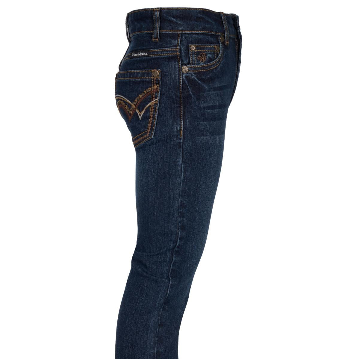 Boot cut, stretch for comfort and movement, mid rise, adjustable elastic waistband on all sizes, logo shank button, metal rivets, woven logo label on back yoke, feature embroidery on back pockets, contrast all over topstitch