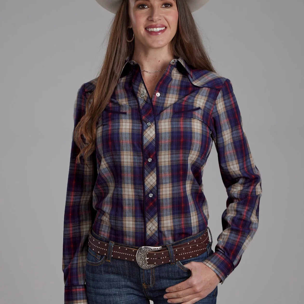 Women's Long Sleeve ShirtCurved 1 Point Back YokePlaid Cotton/Poly BroadclothTrimmed W/Solid PipingSmile Pockets/No Arrow PointsEmbroidery On Back YokeF/B Darts1 Snap Cuff55% COTTON / 45% POLYESTERPlaid - NAVY/CREAM & REDRegularYARNDYE2 PocketSnap