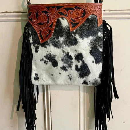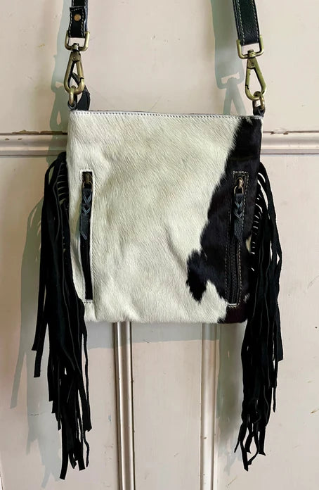 Hair on hide crossbody, with tooled leather trim, removeable shoulder strap and suede fringe. Inside has a small zipper compartment. Safe zipper closure at the top ensures safety of your precious items. Lovely soft hide.